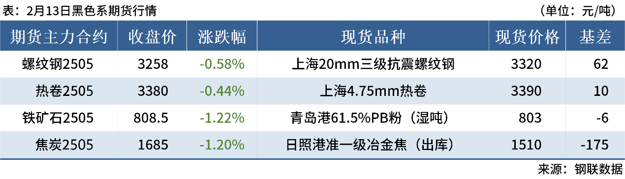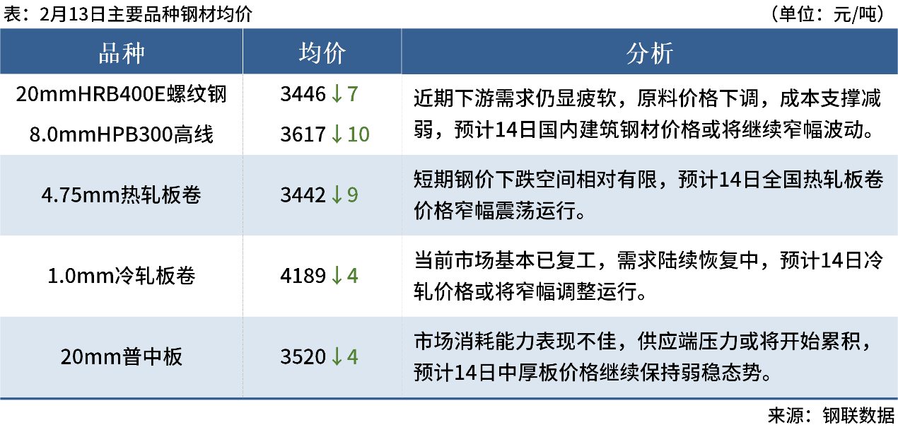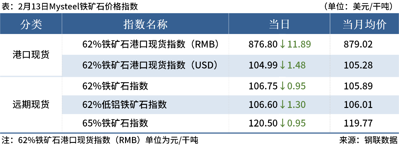 ◎2月13日,全國主港鐵礦石成交114.30萬噸,環(huán)比增12.1%;237家主流貿(mào)易商建筑鋼材成交5.08萬噸,環(huán)比增15.2%。